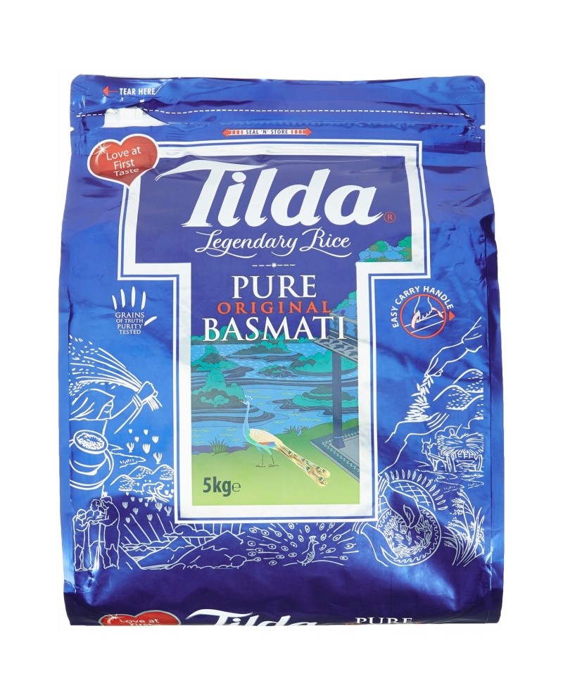 Riso basmati tilda in confezione da 5kg. Puro e di altissima qualità. Coltivato ai piedi dell'Himalaya. Dal sapore raffinato e delicato.