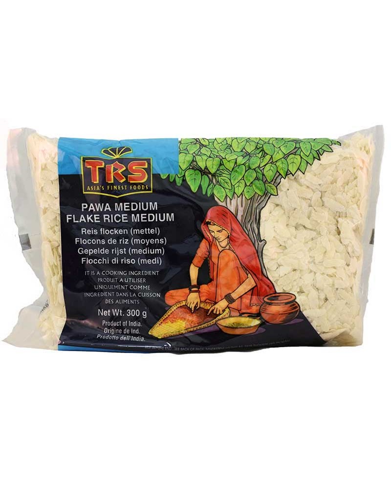 Trs fiocchi riso in confezione da 300g. I pawa indiana sono fiocchi leggeri ottenuti schiacciando chicchi di riso. Da mangiare sia crudi, con acqua o latte freddo o caldo, oppure possono essere cotti con spezie e verdure.