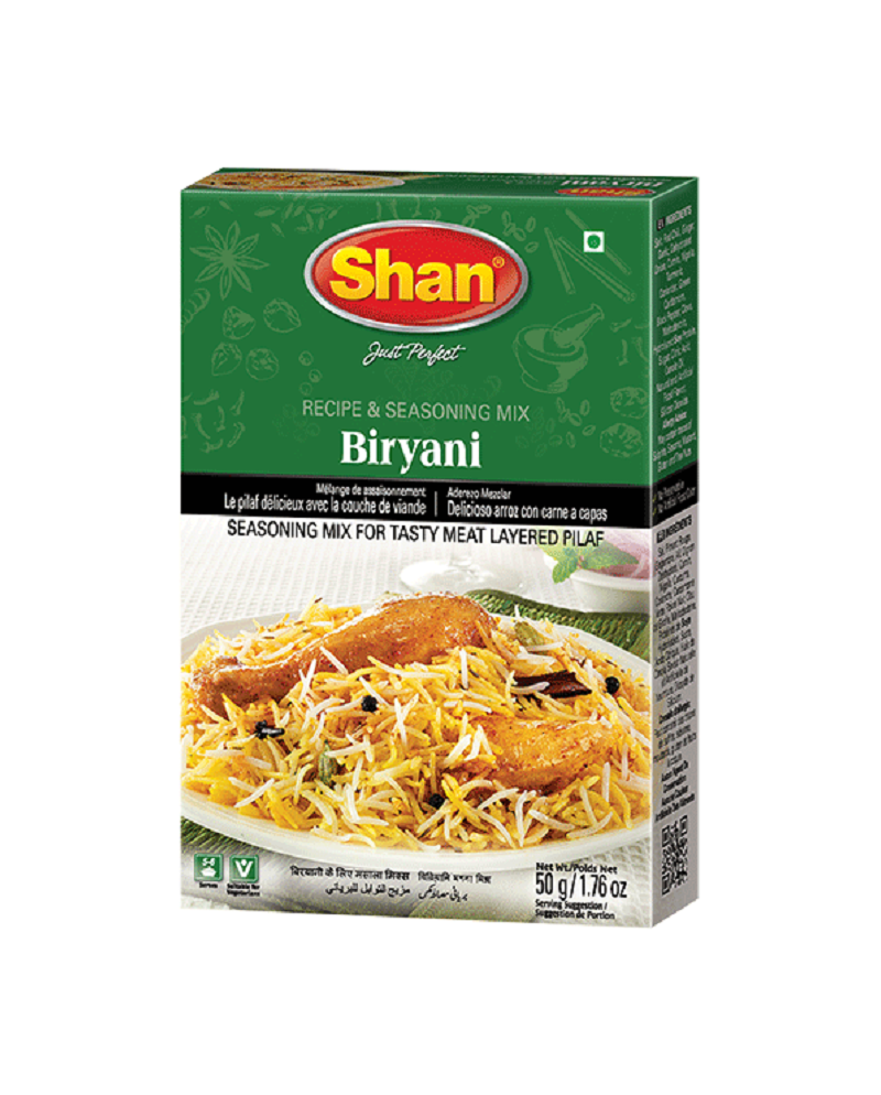 Shan biryani masala in confezione da 100g. Miscela di spezie in polvere pensata per ricreare rapidamente il sapore autentico del Biryani, il celebre piatto di riso Basmati, carne (pollo, agnello, manzo) o verdure tipico della cucina del subcontinente indiano/pakistano. La miscela offre una base aromatica complessa, ricca e intensa, perfetta per la cottura a strati (dum pukht) del piatto.