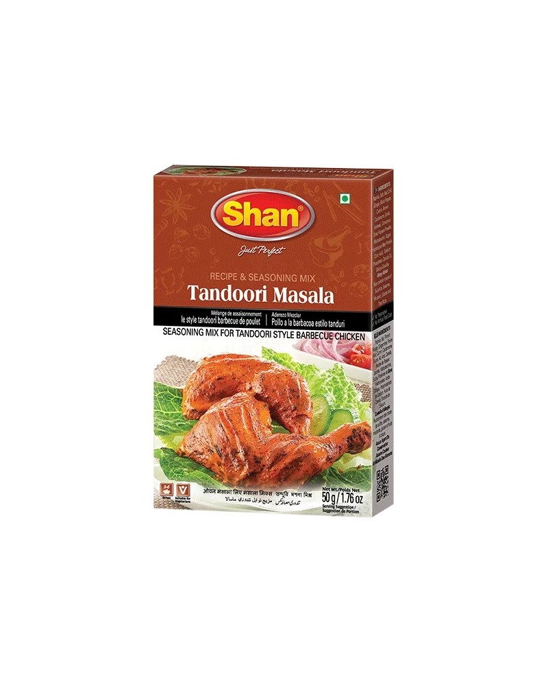 Shan tandoori masala in confezione da 100g. Mix di spezie in polvere ideato per marinare carni, pollame, pesce e verdure prima della cottura alla griglia, al forno (tradizionale o tandoor) o in padella. Il Tandoori Masala conferisce al cibo il sapore robusto e leggermente piccante, arricchito da una forte nota aromatica (grazie a cumino, coriandolo e zenzero) e una colorazione rosso-arancio tipica della cucina Punjabi.