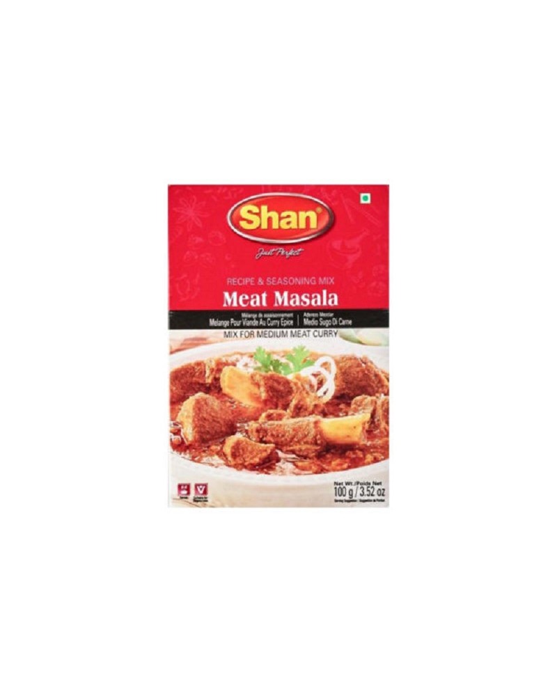 Shan meat masala in confezione da 100g. Mix di spezie universale, specificamente formulato per piatti a base di carne rossa. Il Meat Masala (o Meat Curry Masala) crea un curry saporito e dal gusto deciso, grazie alla prevalenza di spezie calde come cardamomo, cannella e pepe, bilanciate da aglio, zenzero e una nota acidula data dall'acido citrico.