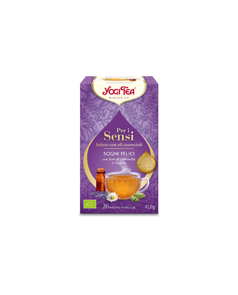 Per i sensi "Sogni felici" Yogi Tea in confezione da 20 filtri. Con olio essenziale di lavanda, fiori di camomilla e luppolo, ti aiuterà a iniziare o concludere la giornata con tranquillità.