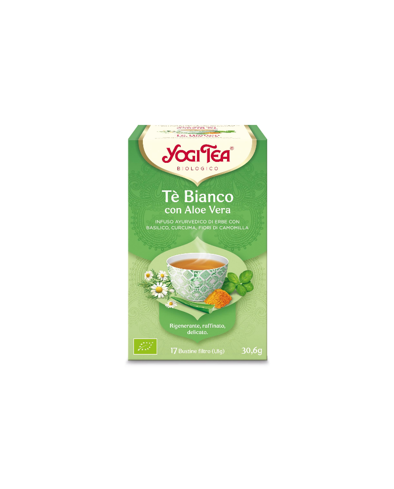 Yogi tea te' bianco con aloe vera in confezione da 17 filtri. Miscela aromatizzata con aloe vera, curcuma e camomilla ideata per idratare la tua pelle grazie alla sua delicata purezza.