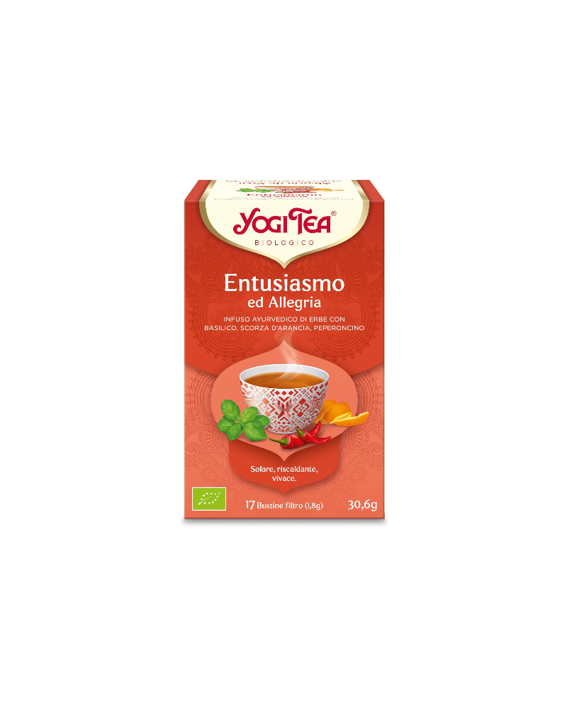 Yogi tea entusiasmo e allegria in confezione da 17 filtri. Con basilico, peperoncino e scorza d'arancia offre una combinazione fruttata e briosa che rinfresca i sensi e suscita gioia.