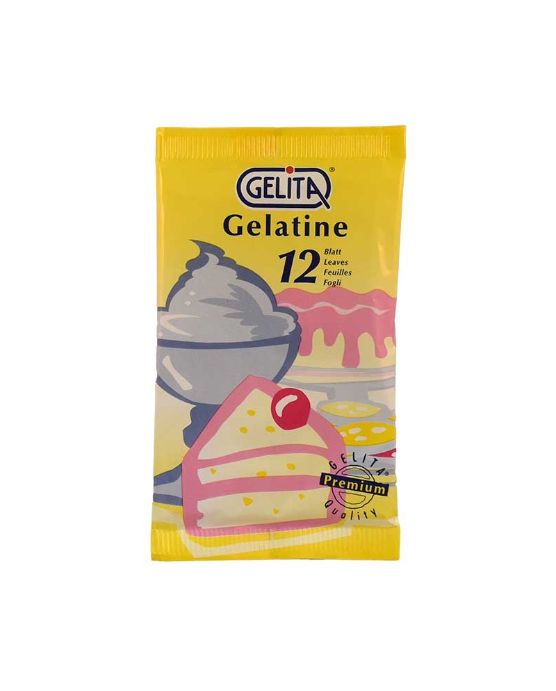 Gelatina alimentare fogli Gelita in confezione da 20g (12 fogli). Gelatina alimentare in fogli è un agente gelificante, anche noto in Italia come "colla di pesce", utilizzato in pasticceria e cucina per addensare e conferire struttura a creme, mousse e aspic.