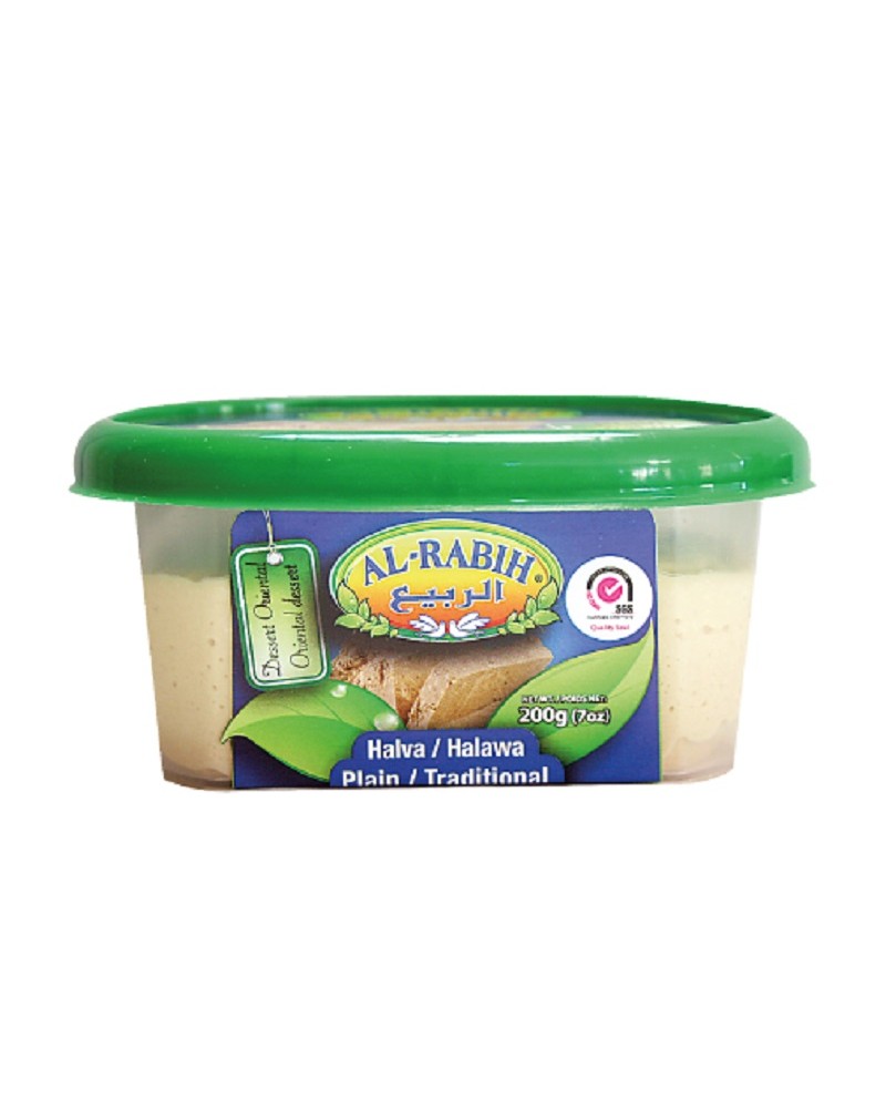 Halawa plain Al Rabih da 454g. Deliziosa e dolce crema di sesamo con aroma di vaniglia. Ideale con pane arabo.