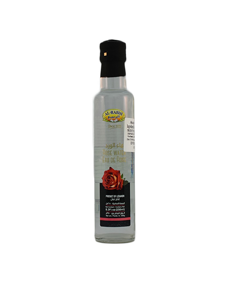 Water rose Al Rabih acqua di rose in bottiglia da 250ml. Essenza gradevole e profumata adatta per aromatizzare i dolci.