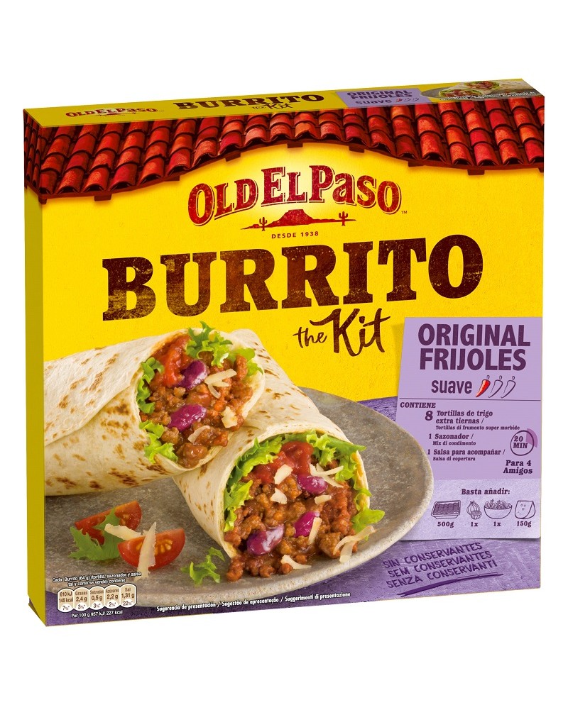Kit per Burritos Old el Paso in confezione da 510g. Preparato per burritos con farina di frumento, salsa original al pomodoro e peperoni, ed un mix di condimenti con fagioli ed una vasta gamma di spezie come curcuma, paprika e peperoncino di cayenna.