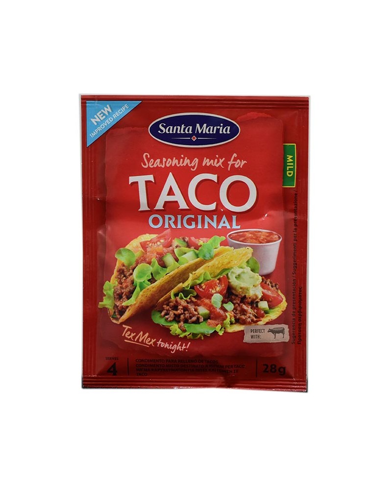 Santa maria spezie miste per taco in confezione da 28g. Le Santa Maria Spezie Miste per Taco sono la miscela classica per insaporire la carne macinata (manzo o pollo) per i tacos. Questa combinazione di erbe e spezie messicane, che include peperoncino, cumino, aglio e origano, conferisce al ripieno il sapore Tex Mex autentico e saporito.