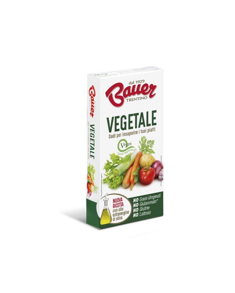 Dado per Brodo Vegetale Bauer 60g. Il Dado Vegetale Bauer è un dado insaporitore che combina un alto contenuto di verdure disidratate con Olio Extra Vergine d'Oliva (EVO) e sale iodato.