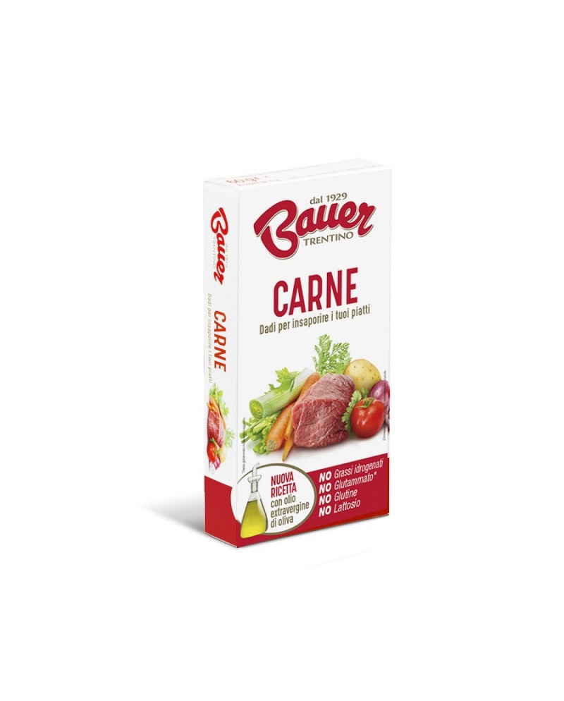 Dado per Brodo di Carne Bauer 60g (6 cubetti da 10g). È un dado granulare compresso per la preparazione di brodi o per insaporire piatti (sughi, risotti, carne). Bauer commercializza il prodotto come senza glutammato monosodico aggiunto, senza grassi idrogenati, senza glutine e senza lattosio.