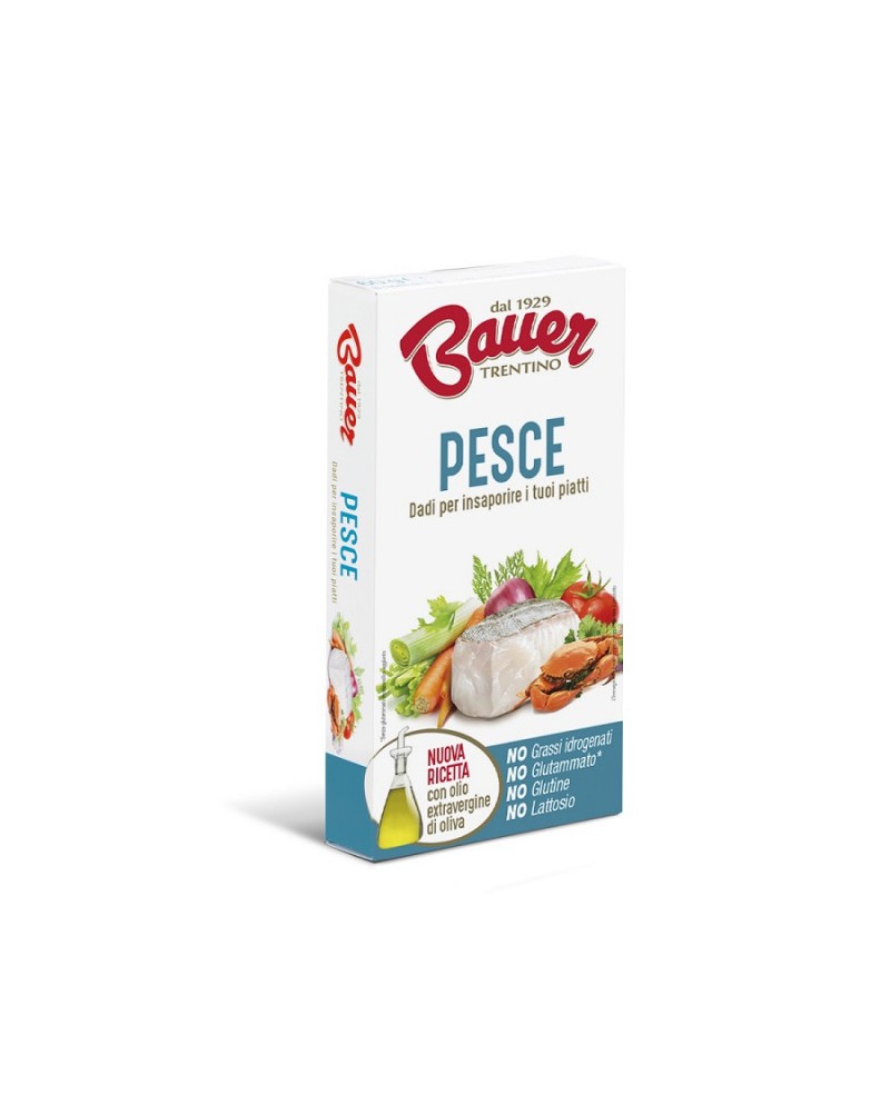 Ill Dado Pesce Bauer è un dado insaporitore che unisce estratti di pesce (come merluzzo, gamberetto e granchio) a verdure selezionate e Olio Extra Vergine d'Oliva (EVO).