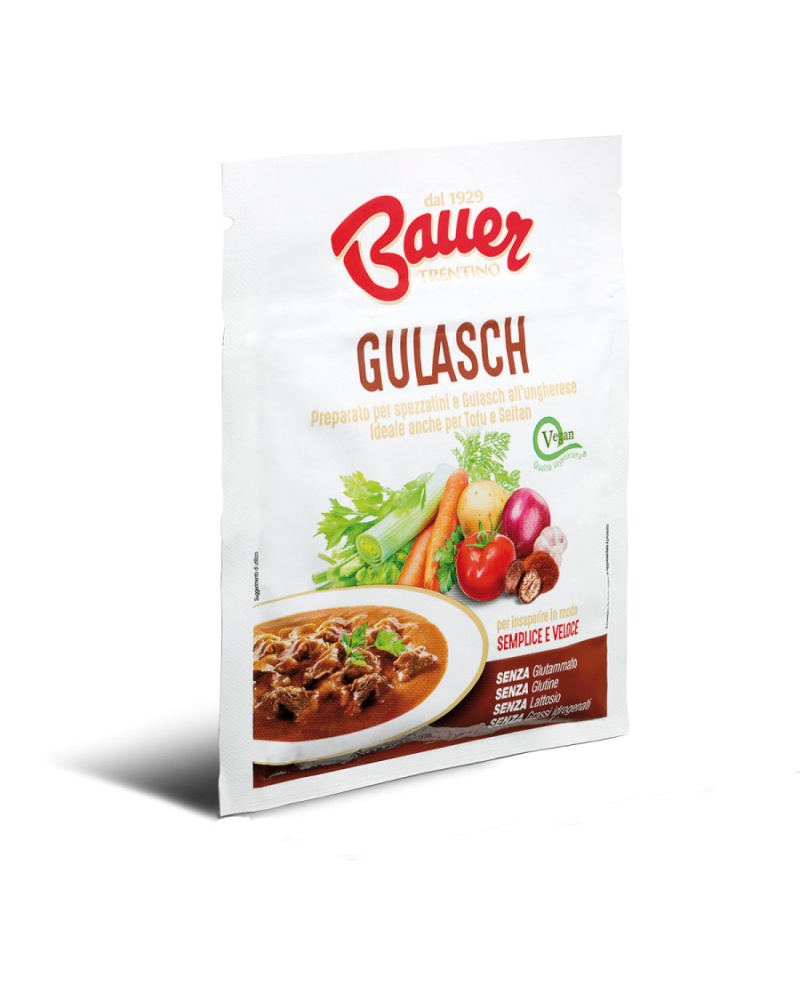 Gulasch Bauer in confezione da 50g. È un condimento in polvere formulato per preparare rapidamente il tradizionale Gulasch o altri spezzatini all'ungherese. Combina farina di riso, verdure, vino e le spezie tipiche del piatto.