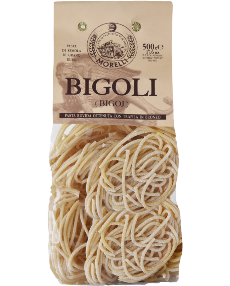 I Bigoli sono un formato di pasta lunga tipico del Veneto, simili a degli spaghetti molto spessi, spesso trafilati al bronzo e tradizionalmente realizzati con farina integrale o con l'aggiunta di uova. La versione Morelli è prodotta con semola di grano duro, acqua e l'aggiunta del germe di grano fresco, che conferisce un gusto più ricco e un alto valore nutritivo. La loro superficie ruvida e il grande diametro li rendono perfetti per sughi robusti, come il classico Bigoli in salsa (con acciughe) o ragù d'anatra.
