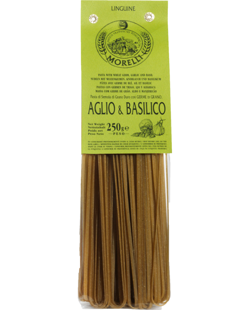 Queste linguine richiamano i sapori classici della cucina mediterranea, unendo l'aroma pungente dell'aglio alla freschezza del basilico. L'impasto, come da tradizione Morelli, è arricchito dal germe di grano fresco, che ne esalta il gusto e le proprietà nutritive. Sono perfette per un condimento leggero, come pomodorini freschi o un semplice soffritto di olio e peperoncino, o per ricette che richiedono una base aromatica decisa.