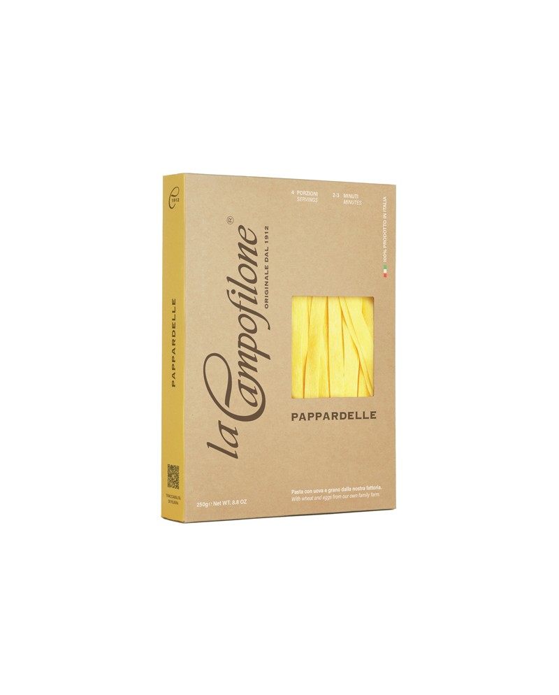 La pasta all'uovo secca Campofilone è prodotta con grani duri selezionati NO OGM e le uova utilizzate provengono da galline allevate a terra. Trafilata in bronzo a bassa temperatura ed essiccazione lenta sotto i 36°C.