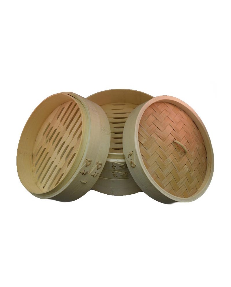 I cestelli di bambù sono uno strumento di cottura tradizionale della cucina asiatica, essenziale per la preparazione di dim sum, pane al vapore (baozi) e verdure. Il bambù è il materiale preferito perché assorbe l'umidità e consente al vapore di circolare in modo uniforme, cuocendo il cibo delicatamente senza renderlo acquoso.