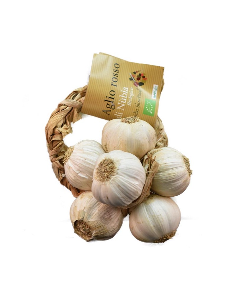 Aglio rosso di Nubia 6 teste intrecciato. L'Aglio Rosso di Nubia è un presidio Slow Food. Viene coltivato nei terreni asciutti, scuri e argillosi circondati dalle saline, all'interno della Riserva Naturale Orientata Saline di Trapani e Paceco e si presenta bianco esternamente e color rosso porpora all'interno. Dal sapore e dal profumo inconfondibile, trova un uso molto versatile in cucina, sia da crudo che da cotto, come aromatizzante o come ingrediente principale.