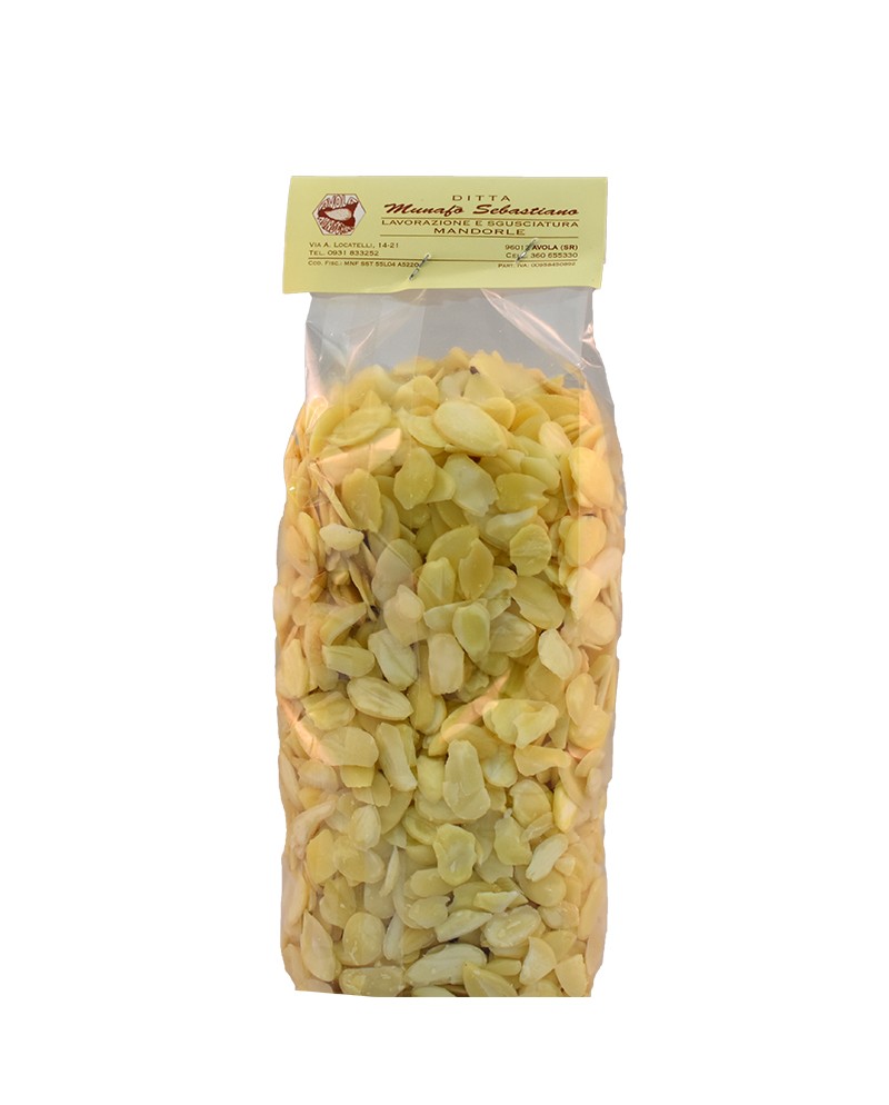 Mandorle pregiate della zona di Avola, pelate e tagliate finemente a fette. Questa presentazione le rende ideali per la decorazione e l'arricchimento di dolci (torte, crostate, muffin), per guarnire gelati e muesli, o per aggiungere croccantezza a piatti salati, insalate e panature.