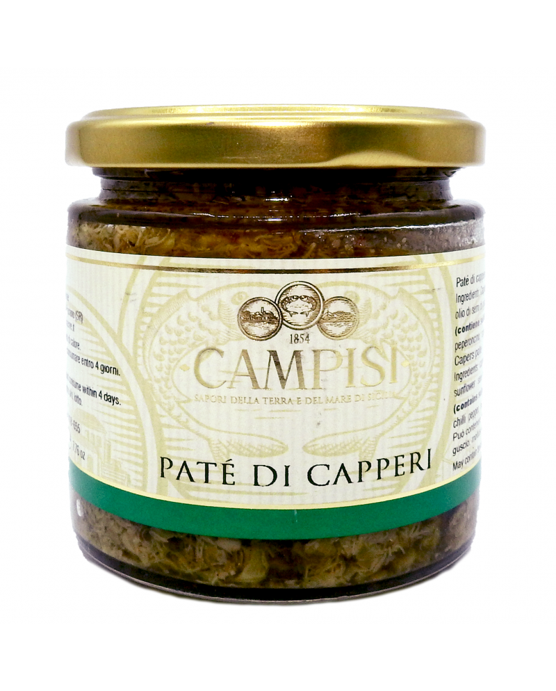 Ingredienti: capperi (65%), olio di oliva (20%), olio di semi di girasole, aceto di mele, (contiene solfiti), menta, peperoncino, origano, sale marino.