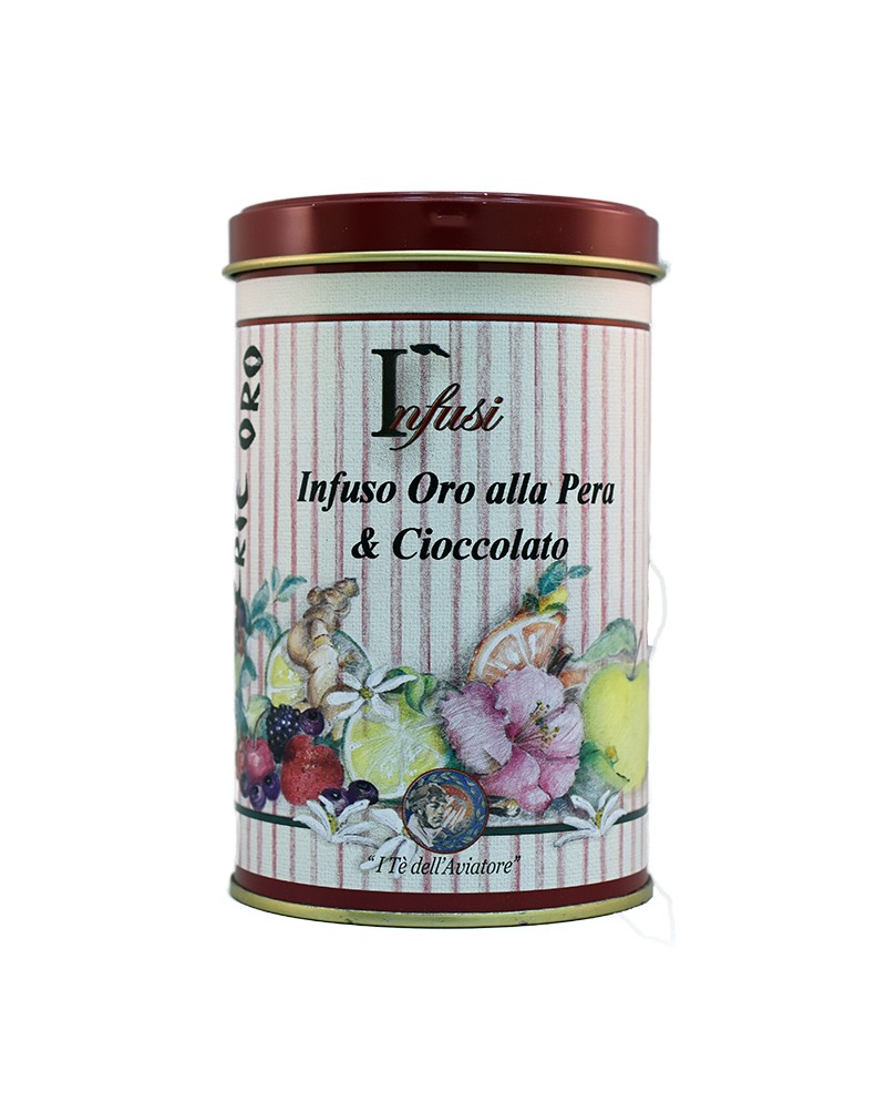 Infuso pere & cioccolato in lattina salva aroma da 100g. Miscela di alta qualità con pera disidratata, scaglie di cioccolato e aromi.