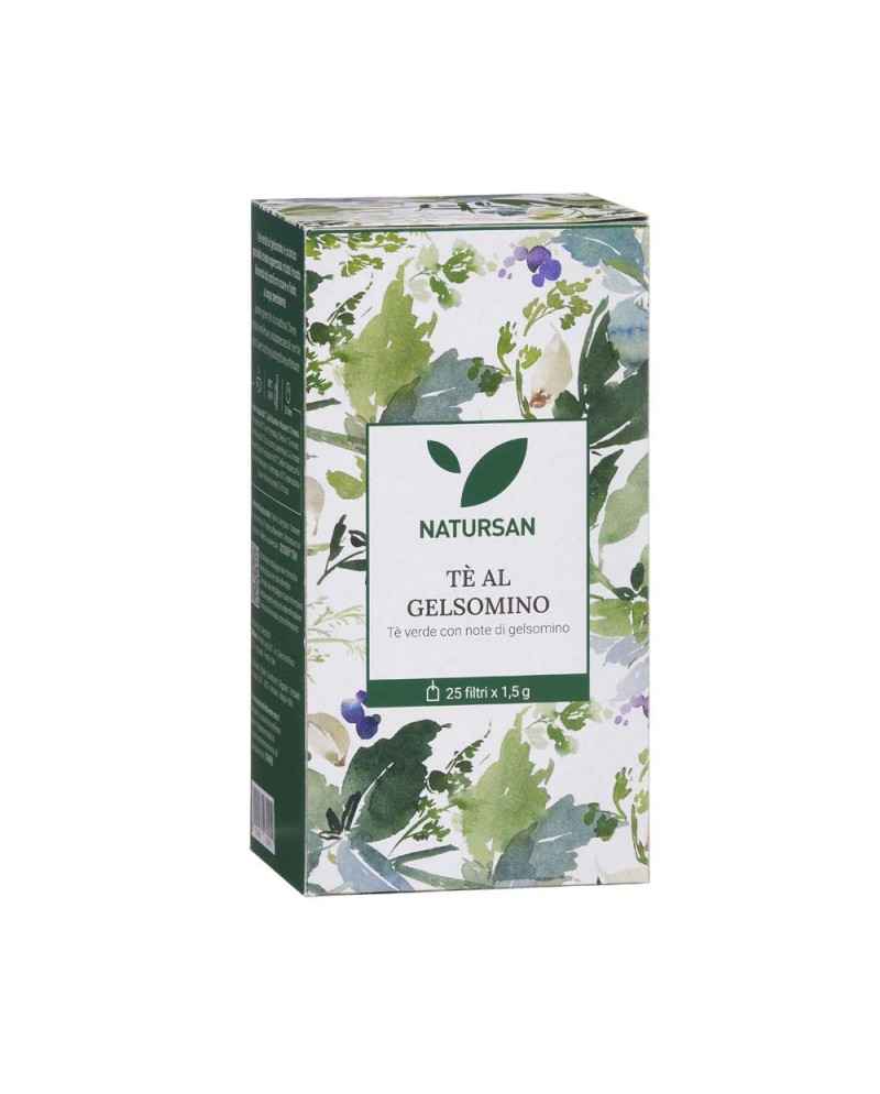 Natursan te' verde con note di gelsomino in confezione da 25 filtri. Dal gusto delicato, è prodotto con fiori di gelsomino scelti accuratamente.