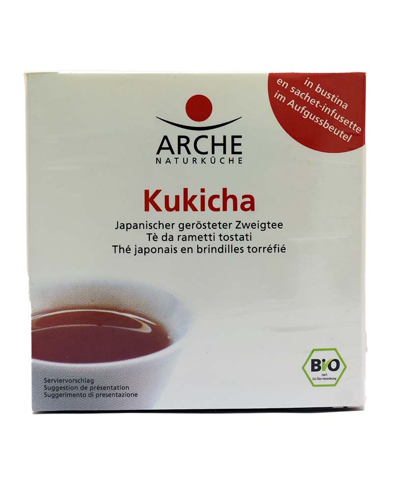 Te' kukicha Arche in filtro da 15g. Tè verde biologico e tostato prodotto in Giappone dal basso contenuto di teina. Morbido ed equilibrato.