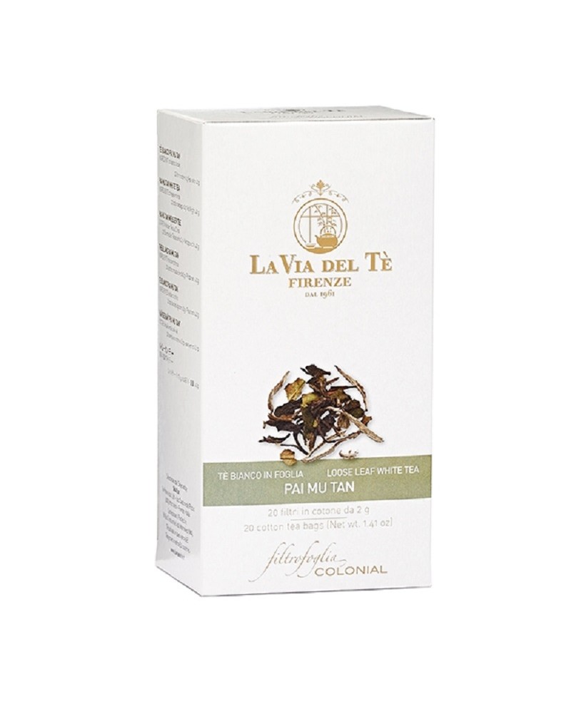 Te' pai mu tan La via del tè in confezione da 20 filtri. Elegante Tè bianco dall'aroma floreale e dal gusto vellutato. Prodotto da una cultivar detta Grande Bianco nel periodo primaverile Aprile-Maggio.