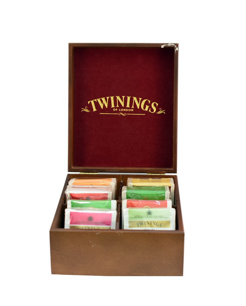 Elegante cofanetto in legno contenente una selezione di 40 filtri di pregiati tè e infusi Twinings. L'assortimento è studiato per offrire una varietà di gusti adatta a ogni momento della giornata, includendo tè neri classici, tè neri aromatizzati, tè verdi e infusi.