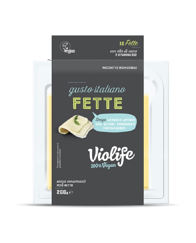 Il "Fette Gusto Italiano" di Violife è un'alternativa vegana al formaggio a fette, priva di latticini, lattosio, glutine e soia. È arricchito con Vitamina B12 e ha un sapore che ricorda i sapori italiani, ideale da fondere per toast, panini o burger.
