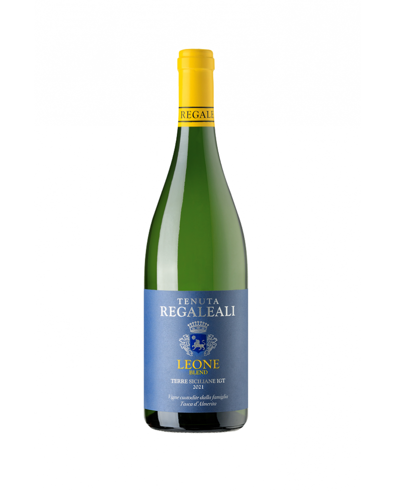 Leone Blend Tasca d'Almerita in bottiglia da 75cl. Vino bianco prodotto con la freschezza aromatica delle uve bianche coltivate in alta collina: in prevalenza Catarratto, Pinot Bianco, Sauvignon Blanc e Traminer per struttura, aromaticità e acidità.
