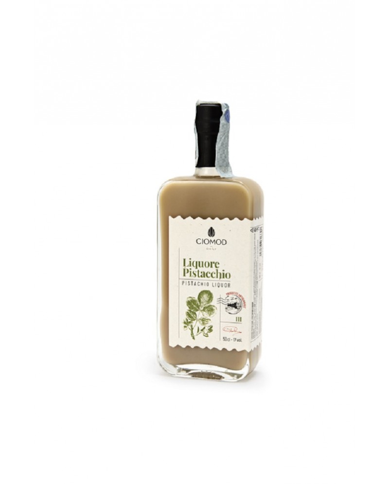 Liquore al pistacchio Ciomod in bottiglia di vetro da 50cl. Gusto delicato, sapore inconfondibile, morbido al palato.