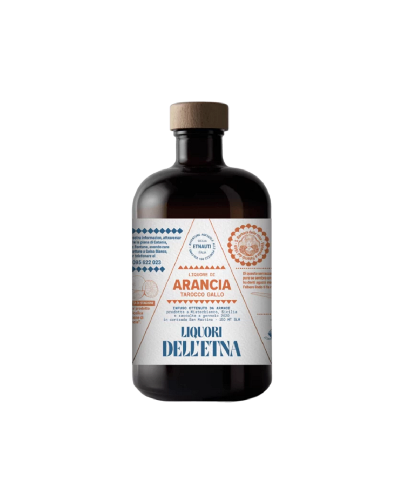 Liquore di arancia tarocco gallo in bottiglia di vetro da 50cl. I Liquori dell’Etna sono prodotti solo con frutta fresca raccolta nelle terre nere dell’Etna.