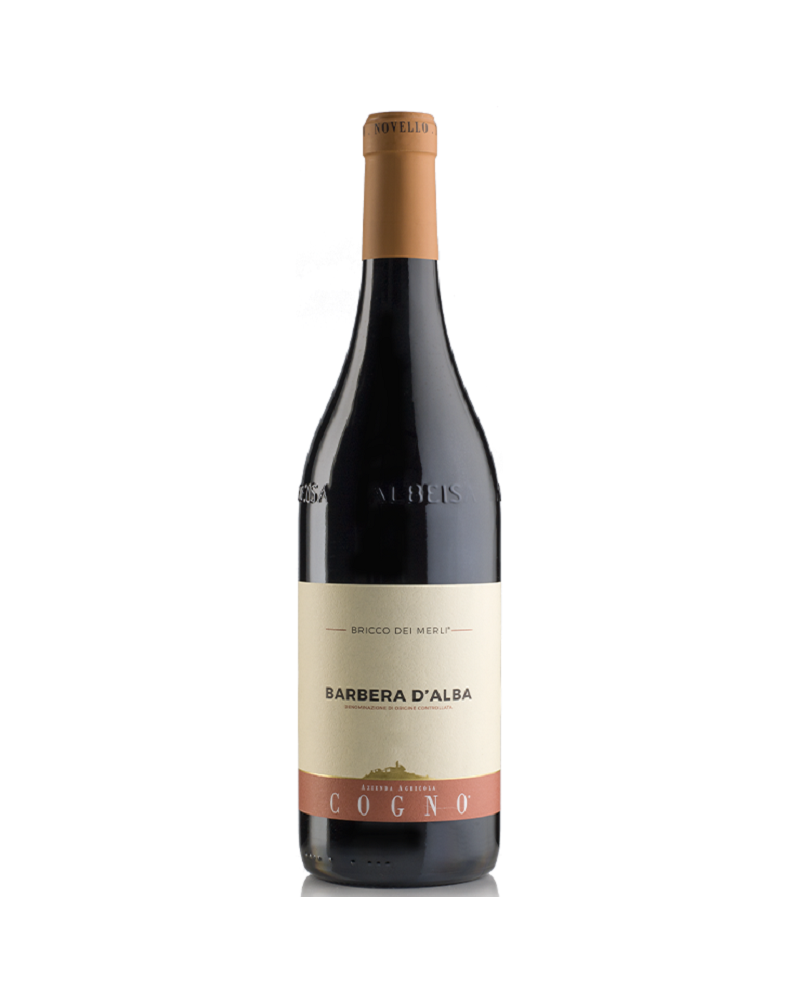 Barbera d'Alba DOC Elvio Cogno Bricco dei Merli in bottiglia da 75cl. Vino rosso di grande carattere, dai profumi, profondi e armonici. In bocca si offre con notevole potenza, addolcita da un'ampia morbidezza; la struttura è ottima e si accompagna ad una vivace freschezza acida; i sapori rimandano alla confettura di marasche e di prugne, con un lungo finale di uva appassita.